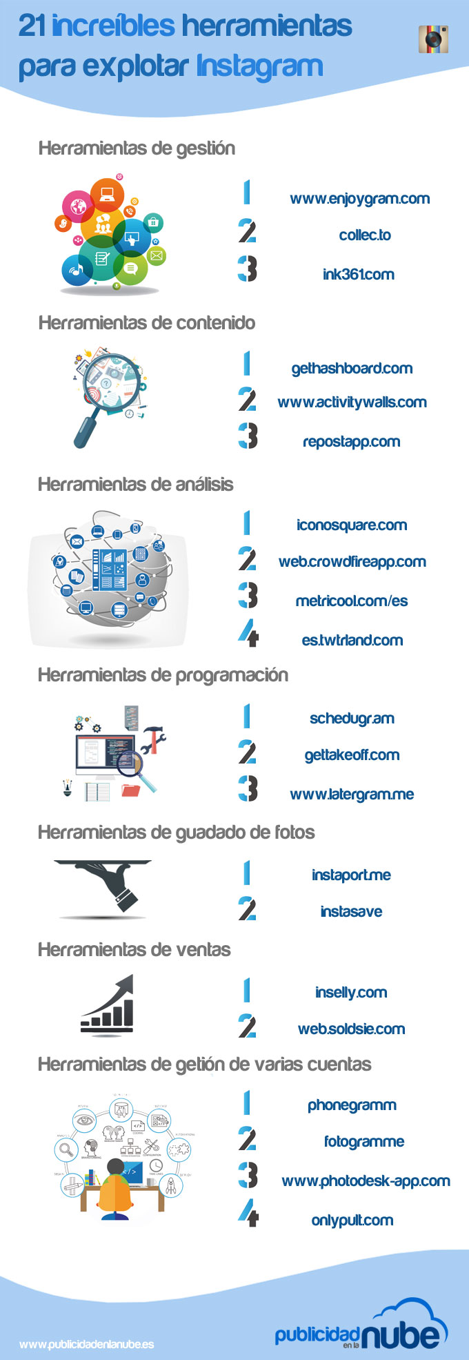 Para poder exprimir todo el potencial que posee la red social, y del mismo modo que les sucedió a sus predecesoras, cada vez son más las aplicaciones que aparecen o se amoldan a esta tendencia que ven como se va consolidando. Para ello he seleccionado 21 herramientas para explotar Instagram y sacarle el máximo partido. Dividiéndolas de la siguiente manera: